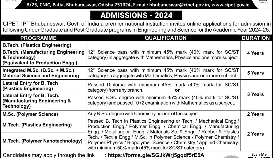 Admissions open – 2024 at CIPET:IPT-Bhubaneswar Courses : Integrated M.Sc. in Material Science & Engineering, B. Tech. (Plastics Engg.) & B. Tech. (Mfg. Engg. & Tech.), Contact: 9692417472/ 8170044113/8144919800 Last date for online application: 29.05.2024, for details visit : www.cipet.gov.in
