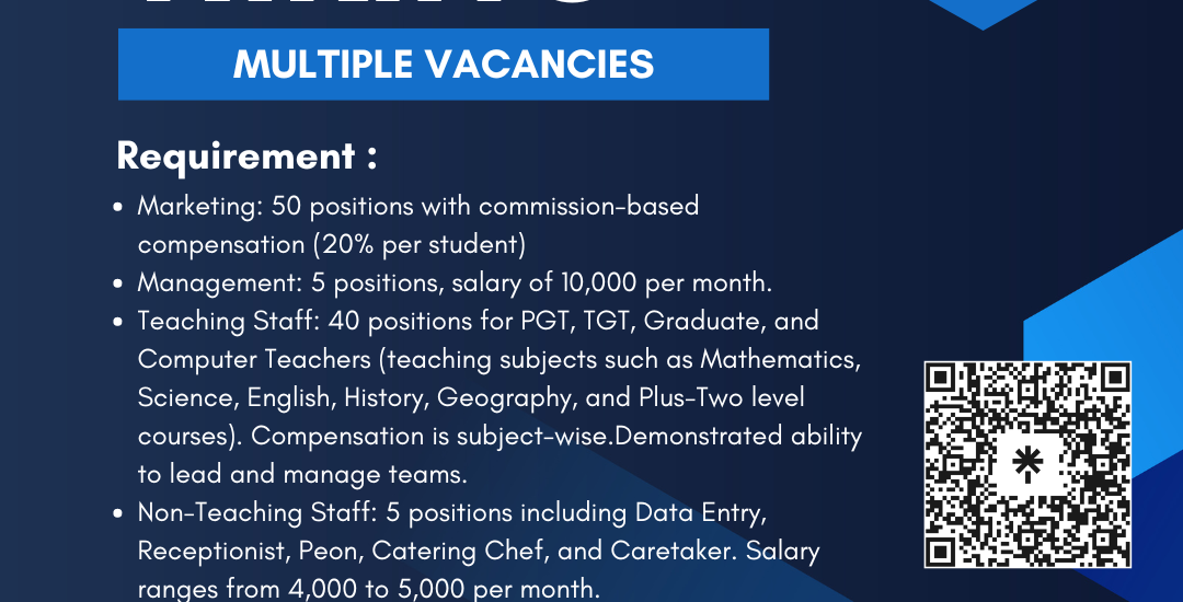 - Teaching Staff: 40 positions for PGT, TGT, Graduate, and Computer Teachers (teaching subjects such as Mathematics, Science, English, History, Geography, and Plus-Two level courses). Compensation is subject-wise.