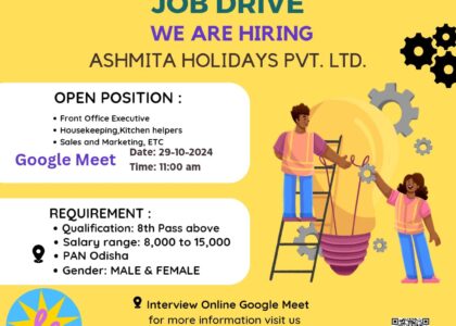 Job driveONLINE JOB DRIVE FOR ASHMITA HOLIDAYS 29-10-2024 Oct 25, 2024 MCC1 Comment on ONLINE JOB DRIVE FOR ASHMITA HOLIDAYS 29-10-2024 ONLINE JOB DRIVE FOR ASHMITA HOLIDAYSTuesday, October 29 · 11:00am – 12:00pmGoogle Meet joining infoVideo
