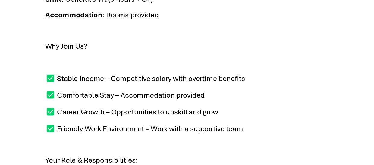 Shift: General shift (9 hours + OT)