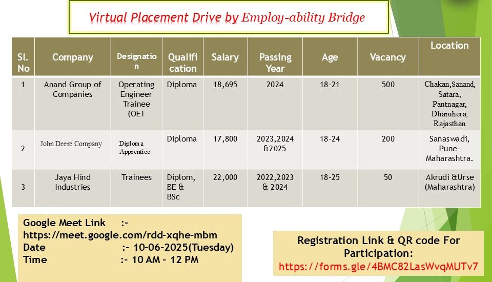 | 2 | John Deere Company | Diploma Apprentice | Diploma | 17,800 | 2023,2024 &2025 | 18-24 | 200 | Sanaswadi, Pune-Maharashtra. |
