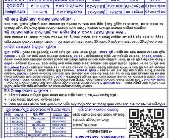 Recruitment drive for the post of Security Guard in the 13 Block of Keonjhar district as per the program given below.