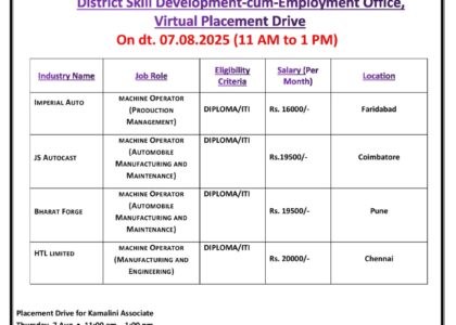 🗓 Date: 19th SEPTEMBER, 2025Time 09:30 am🏢 Interview Venue:District Skill Development cum Employment Office/ Model