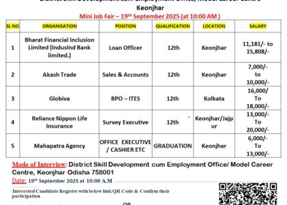 🗓 Date: 19th SEPTEMBER, 2025Time 09:30 am🏢 Interview Venue:District Skill Development cum Employment Office/ Model